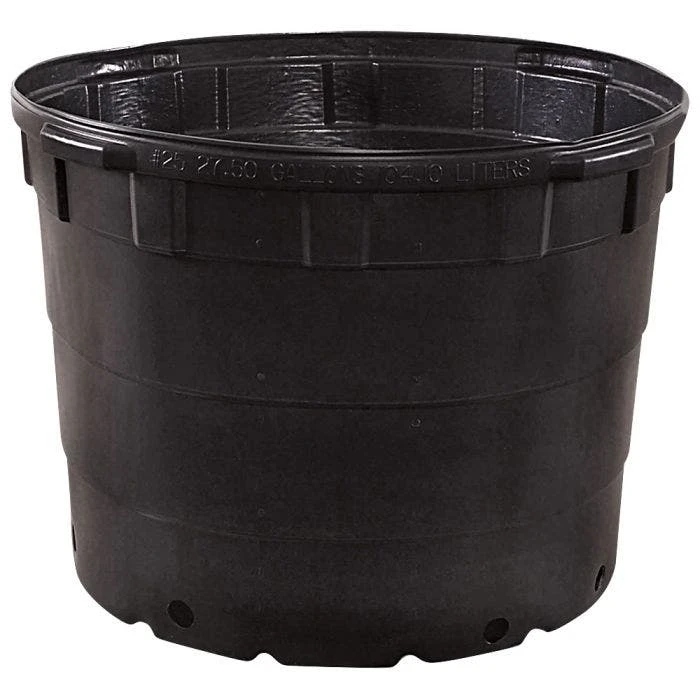 The Haviland Nursery Containers have a top diameter of 24 inches and a height of 18 inches. They have a volume of 27.5 gallons (104.1 liters) and a trade size of 25. Each bundle contains 10 containers.