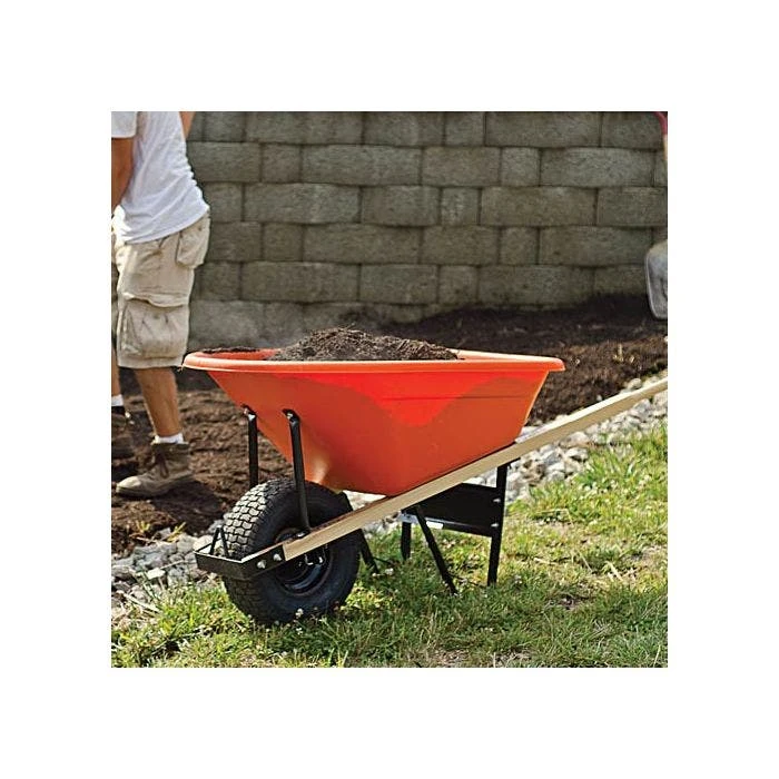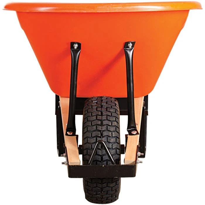This Leonard 6-Cubic-Foot Capacity Poly Tray Wheelbarrow features a durable orange ABS plastic tray. Its extra-thick hardwood handles measure 1-5/8-inch by 2 inches and are 5 feet in length.