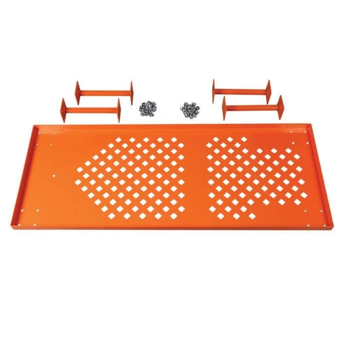 We designed these bolt-on shelves to fit our Leonard 4-Wheeled Flatbed Carts with 24-Inch by 60-Inch Decks. This kit includes a heavy-duty, 11-gauge steel deck and four legs. We include 7-gauge mounting plates and 3/8-inch carriage bolts for mounting. Choose your desired shelf height below. These shelving kits double the carrying capacity of your Leonard 4-Wheeled Cart. These carts are perfect for moving flats, potted shrubs, or bagged materials. The extra storage space makes them ideal garden centers or nurseries. Diamond-shaped drainage holes in the deck prevent water from pooling on the shelf. We engineer these shelves to last! We apply an orange powder-coat to the heavy-gauge steel decks. This coat protects the shelves from rust and corrosion. We back these products with our lifetime warranty! Do you have one of our smaller carts? Click HERE for our selection of 24-inch by 48-inch shelves!
