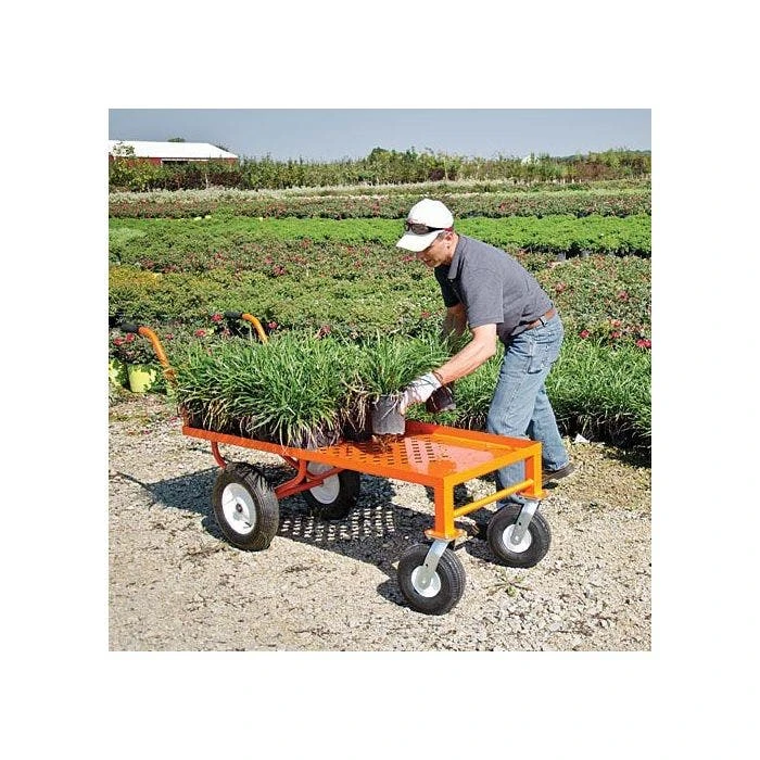 We outfit this cart with four pneumatic tires; two 16-inch tires in the rear and two 10-inch tires under the swivel caster. Use Leonard Nursery Carts to move nearly anything. They are ideal for flats, potted shrubs, or bagged materials. The deck maintains a flat surface, and the 1-1/2-inch side lips prevent materials from sliding off. The diamond-punched grid makes the cart lighter and allows water to drain instead of pooling on the deck.