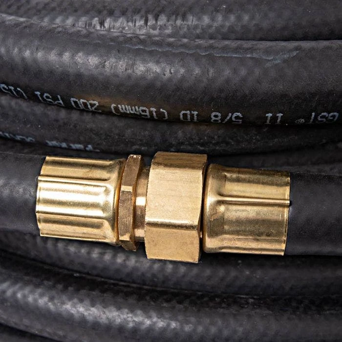 This premium rubber hose is built for heavy duty use. EPDM material remains flexible in extreme conditions and is abrasion, heat and ozone resistant. Com. This hose has a 200 psi operating pressure strength and an 800 psi burst strength allowing this hose to be very adaptable to varying water sources. Solid brass couplings add durability. Made in the United States. Available in 50ft and 100ft lengths