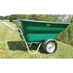 A front sliding door makes for easy dumping and the heavy-duty pneumatic tires keep you rolling along smoothly. 1/2-inch exterior grade plywood, galvanized and plated-steel components for strength and rust-resistance. A generous 13.6 cubic foot tray is the perfect size for any job – from routine yardwork to large projects.